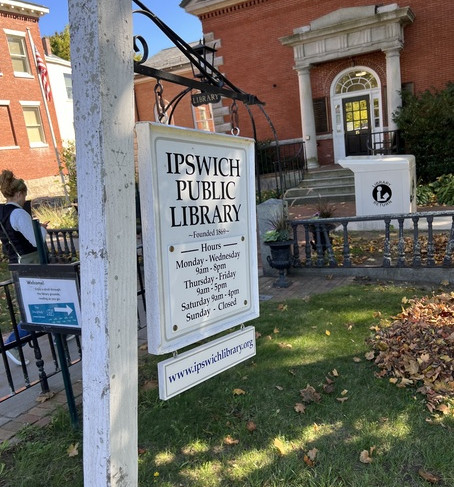 We set off for Ipswich on a spectacular autumn day. Not a cloud in the sky, perfect 70 degrees and foliage on display. While I had traveled through Ipswich, it is a town I was not familiar with. The few hours spent there on this "Library Adventure" has made me wonder why it took me so long to explore this beautiful part of our state.